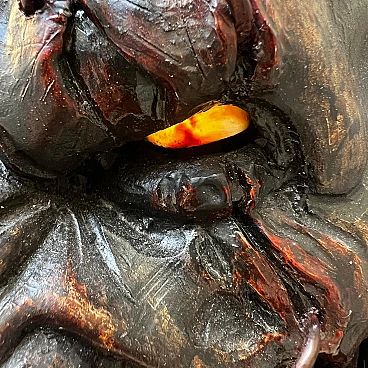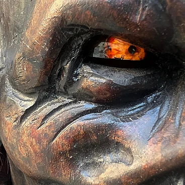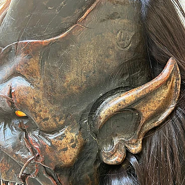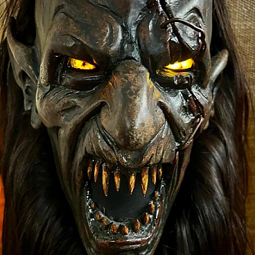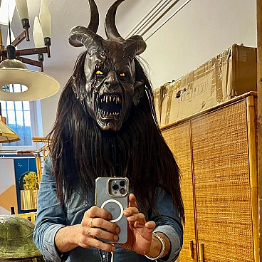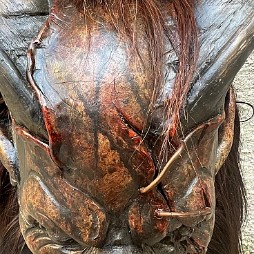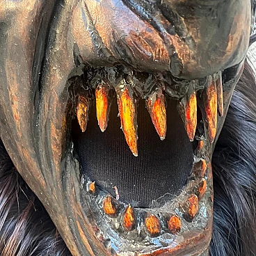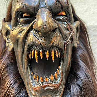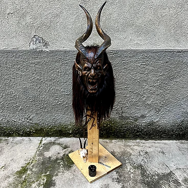 Carved stone pine wood and goat hair Krampus mask by Luca Pojer, 2019. This is not just a mask but an authentic work of art. It is important to note that masks of this level are extremely rare: the artists who create them sell them only to those who play one of these demons, and, of course, those who own them jealously guard them. This mask is entirely handmade: the wood is hand-carved, the skin and hairs are carefully applied, the horns are made of resin, and the entire work is decorated and hand-painted by artist Luca Pojer, considered perhaps the most exclusive in this field. The mask comes with a handmade stand, an envelope with the artist's logo and a certificate of authenticity. But who is the Krampus? In the mythology of German-speaking and, to some extent, Slavic and Latin regions, the Krampus is a demonic being that accompanies the religious and folkloric figure of St. Nicholas. This tradition, linked to Christian mythology, describes the Krampus as a demon defeated by St. Nicholas and thus forced to serve him. The term "Krampus" comes from Middle High German and means "something dry and lifeless." The earliest written accounts of Krampus date from the 15th and 16th centuries. The story goes that in times of famine, young men from mountain villages would disguise themselves in furs made of feathers, hides and animal horns to terrorize nearby villagers and steal supplies for the winter. One day, they discovered that a real demon had infiltrated among them, recognizable only by its goat's paws. Bishop Nicholas was called in to exorcise the demon, and after defeating him, the young men began to parade disguised as demons on the eve of St. Nicholas, no longer to plunder but to "punish" the naughty children, accompanied by the bishop who had defeated the demon. Krampus parades today are exhibitionist events that entertain young and old alike. These demons, with monstrous and animalistic features, roam the streets in search of "bad" children. They wear devilish masks, ragged and dirty clothes, and make noise with cowbells and horns while striking people with whips. This custom, proudly maintained in many places in the former Austro-Hungarian Empire, dates back to pre-Christian times and at least to the 6th-7th centuries AD, and is linked to the winter solstice. These events, which take place on December 5, the eve of St. Nicholas, are over 500 years old and are still celebrated in Slovenia, Germany, Croatia, Austria and Italy (Trentino-Alto Adige and Friuli-Venezia Giulia). Curiously, according to tradition, only men wear masks, and sometimes they also wear women's clothes. A basic rule is that the mask should never be taken off in public and no one should attempt to remove it, on pain of dishonor for those unmasked.