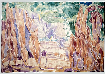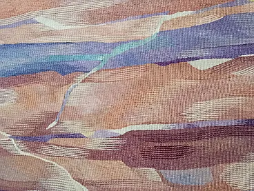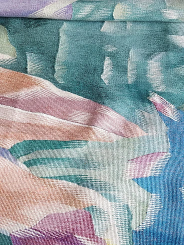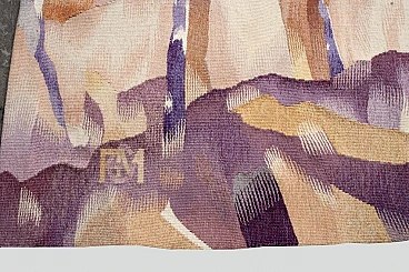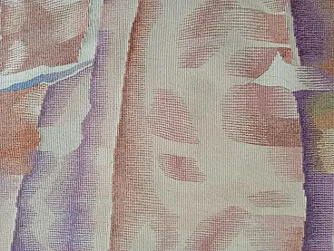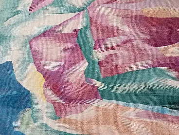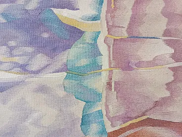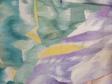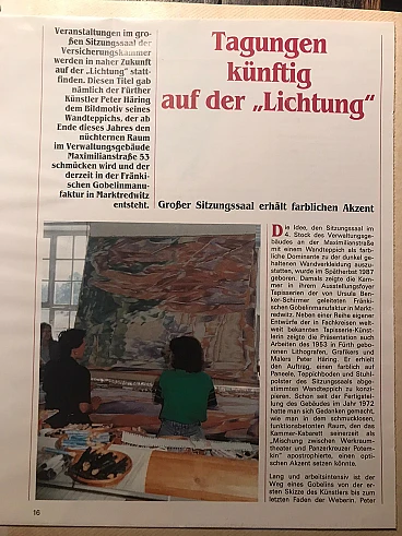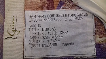 Lichtung ("Clearing") tapestry hand woven in Germany using the French gobelin technique. This large tapestry, measuring 315 x 228 cm, was commissioned for a conference room and is the result of the work of three master artists. It was commissioned in 1988 by the MGF (Fränkische Gobelin Manufaktur) of Marktredwitz in Bavaria, founded in 1975 by Ursula Beneker-Schirmer, who, after studying in France, started a tapestry production in Bavaria that included personally designed pieces. Furthermore, she collaborated with other artists, including Henry Moore, Herbert Bayer, Georg Meistermann and Heinz Trökes. Bavarian artist Peter Haring (1953-2011) was commissioned to create the design. After studying the environment and furnishings, he created the life-size design in oil on canvas, then created the so-called watercolor "cartoni" that were used for the tapestry weaving process. The hand weaving of the tapestry was entrusted to Lilly Grimm-Seidinger. She worked as a tapestry weaver at the MGF in Marktredwitz in Bavaria (Germany) as a student of Ursula Benker-Schirmer until 1991, when she began weaving independently collaborating with well-known artists (such as Herbert Bayer, Max Hermann, Georg Meisternann and many others). The work took about a year to complete. During this period, director Ursula Beneker-Schirmer, weaver Lilly Grimm-Seidinger and artist Peter Haring met continuously to discuss how to proceed, as it was sometimes necessary to change colours, materials and designs to fit the weaving lines. To highlight some details of this work, they experimented with the use of linen (which was not used in this type of tapestry), which, together with the brightness of the silk, created a great effect that stands out against the wool work. One of FGM's most important works was the 42 square meter tapestry for Chichester Cathedral in England, designed by Ursula Benker-Schirmer and executed by the skilled hands of weaver Lilly Grimm-Seidinger between 1982 and 1985, representing the creation of the world. The tapestry is complete with a declaration from the weaver which authenticates her work.