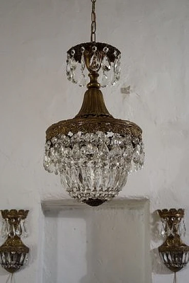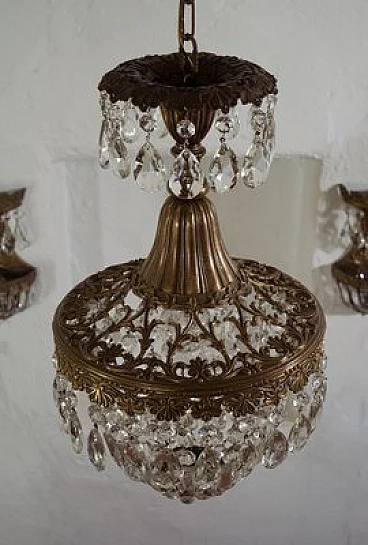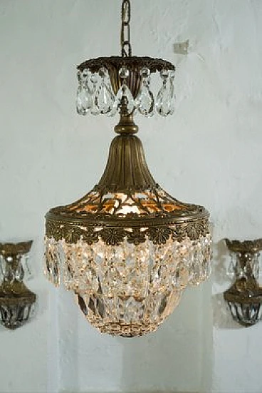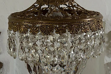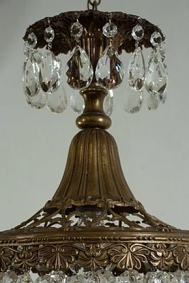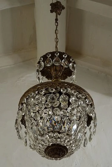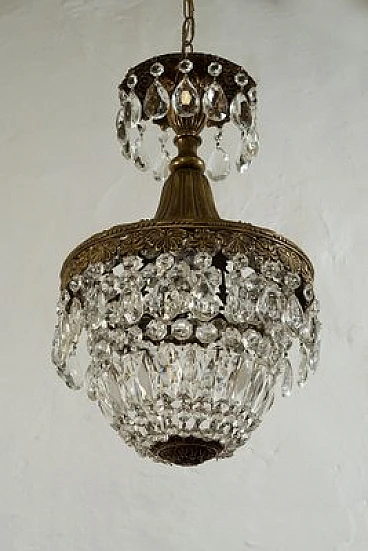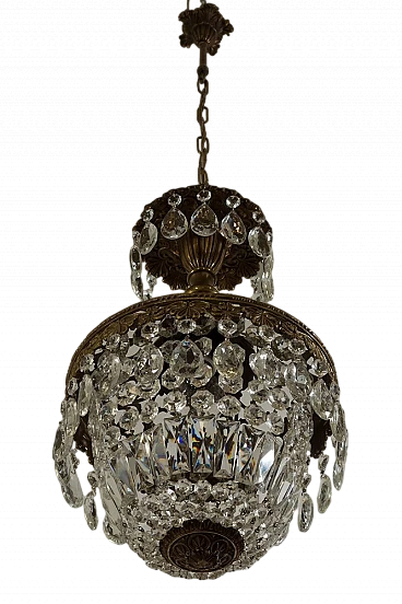 Vintage Art Deco style chandelier in the shape of a hot-air balloon, made of brass and hanging drops. This chandelier consists of a sturdy brass frame with embroidery at the top that lightens and embellishes the figure, making it luminous. The lower part is harmonised by a balloon formed of octagons, lozenges and almond-shaped glass drops. The chandelier is able to embellish any environment whether classic or modern, suitable for the bedroom, hallway, kitchen, bathroom and living room. Restored and fully functional, 1 light E27.