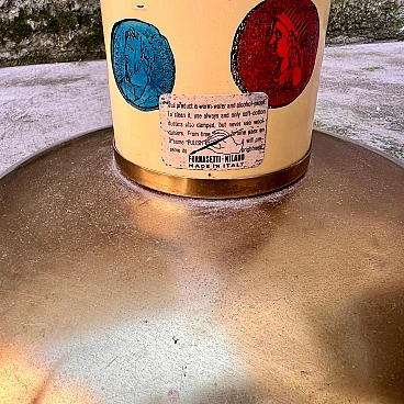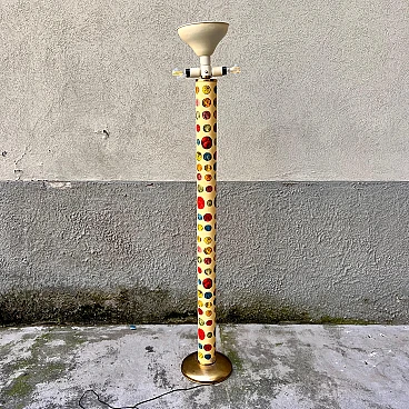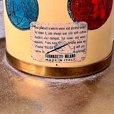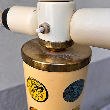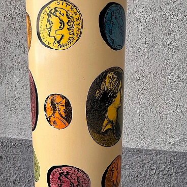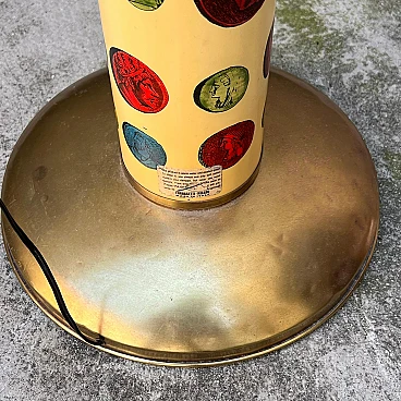Floor lamp by Piero Fornasetti, 1950s. It is in almost excellent condition. It has a cylindrical shape with a round base in gilded metal. The body is decorated with a distinctive pattern of ancient colored coins, typical of Fornasetti's eclectic and playful style. The top has a white finish with two side arms that support light bulbs, as well as the main lamp holder. This lamp not only illuminates but also adds an artistic and unique touch to any room. Perfect for collectors and lovers of interior design, it represents a piece of great aesthetic and cultural value.
