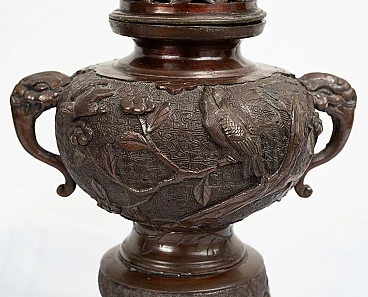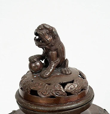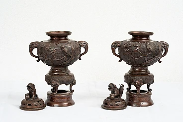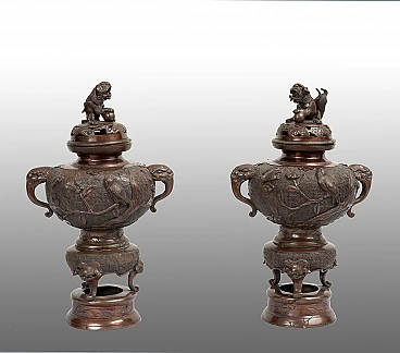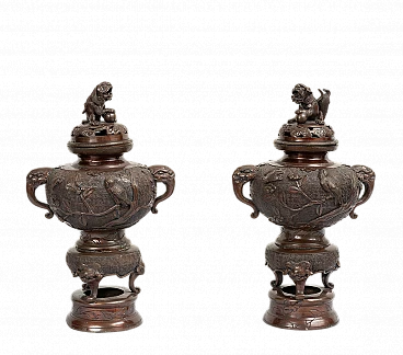Pair of patinated bronze perfume-burning vases belonging to the second half of the 19th century. The central body is embellished with plant elements alternating with birds and bears two elephant-shaped handles. The lid is embellished with a sculpture of a Japanese lion. Provenance: 19th century Japan.