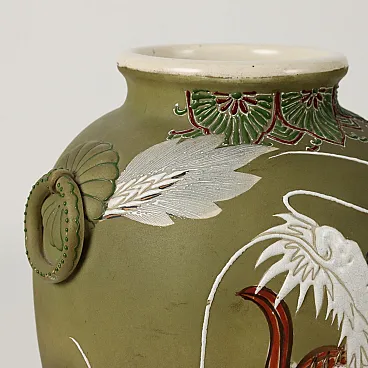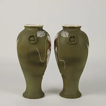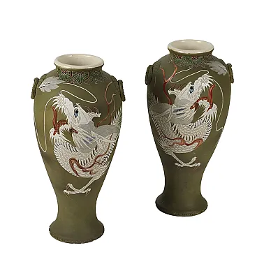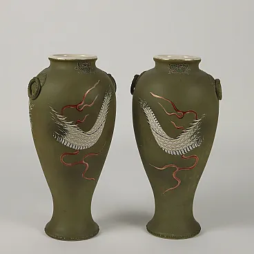 Pair of ceramic vases with dragon decoration and small ring handles. Japan, 20th century.