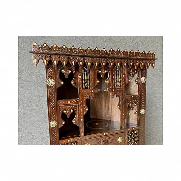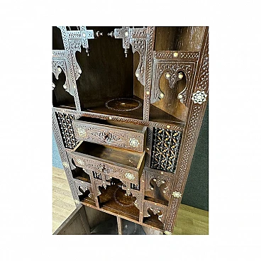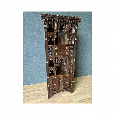 Elegant antique Syrian corner piece made of carved walnut with shell inlays, late 19th cent. It is constructed of hand-carved walnut wood. The wood is carved with an intricate geometric design and has sporadic shell inlays. The front features open compartments, drawers nor doors in the lower area. Refined and elegant are the openwork elements, the inserts formed by small turned parts fitted together.