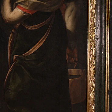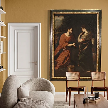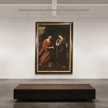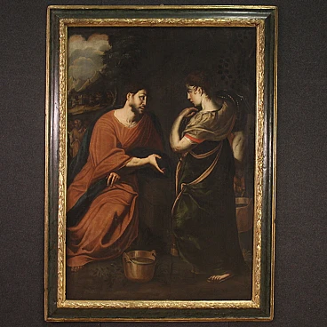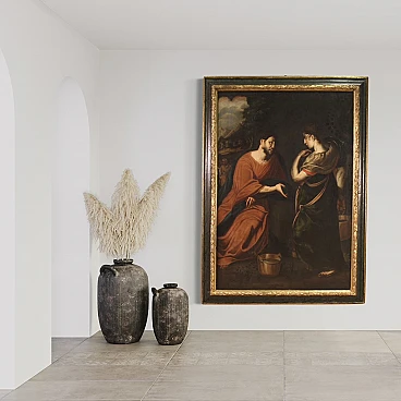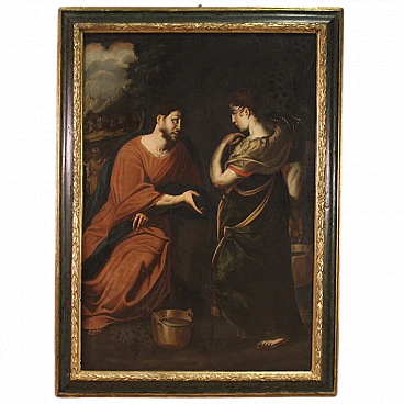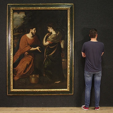 Lombard school oil painting on canvas from the second half of the 17th century depicting Christ and the Samaritan woman at the well. Jesus is on a journey and decides to stop by a well. A Samaritan woman approaches him and he asks her for a drink. To the Jews, the Samaritans were unclean and so they avoided them and did not speak to them. Jesus is unconcerned about this tradition, and the woman reacts with amazement. Painting of remarkable pictorial quality, found particularly in the execution of the drapery of the garments. Monumental-sized painting with life-size figures, suitable for a large reception hall or private chapel. Stunning antique coeval frame in carved, painted and gilded wood, with some signs of time. Work that has been restretched and has undergone restoration with frame replacement and color repainting in places. Overall in good state of preservation. Size without frame: 189 x 130 cm.