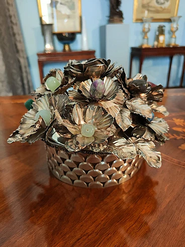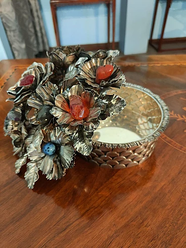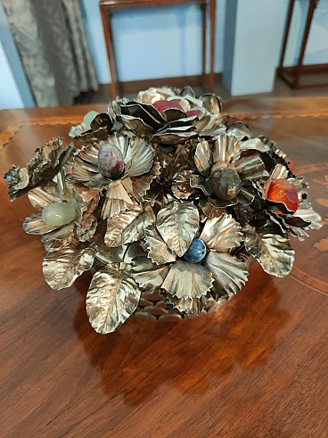 Beautiful box in silver and semi-precious stones. The box is characterised in the lid by this beautiful work with leaf elements enriched with acorns in semi-precious stones. 19th century silver. 20th century period. Dimensions: 13 x 23 x 23 cm.