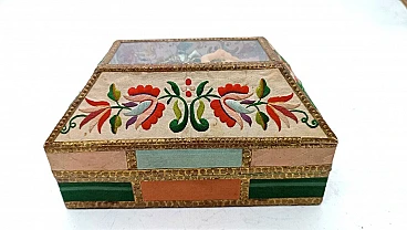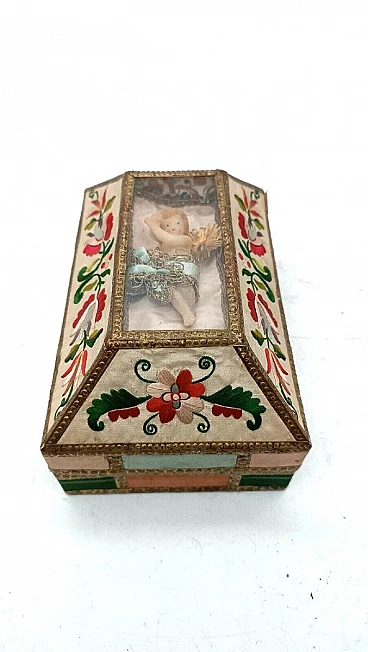 Embroidered fabric box with shrine and wax Baby Jesus, 19th century
