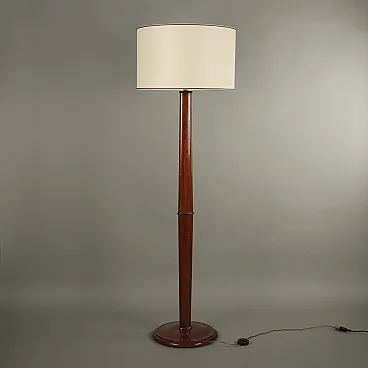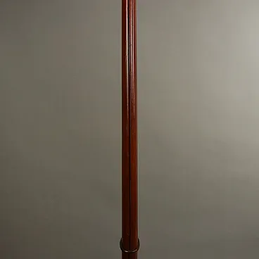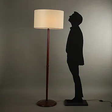 Vintage floor lamp with base and stem in stained beech wood, fabric lampshade, brass details. Itallian production, 1950s-1960s.