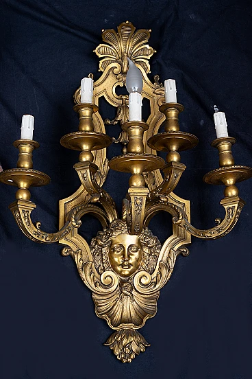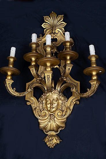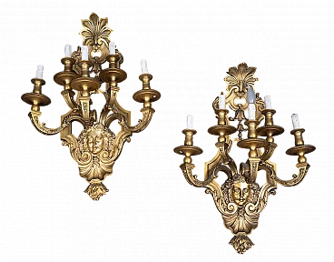 Pair of French Napoleon III expertly chiseled gilt bronze wall lights, 19th century. The front features five chiseled raceme arms resting on a mascaron with shell below. The top takes on a sinusoidal walk and features a beautiful, finely chiseled cymatium. Complete with certificate of authenticity. We are at your disposal for further clarification or photographic details. Shipment throughout Italy, Europe and the Rest of the World in maximum security and traceable. Shipping will be arranged privately.