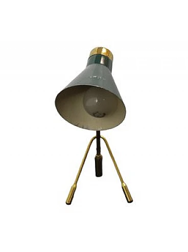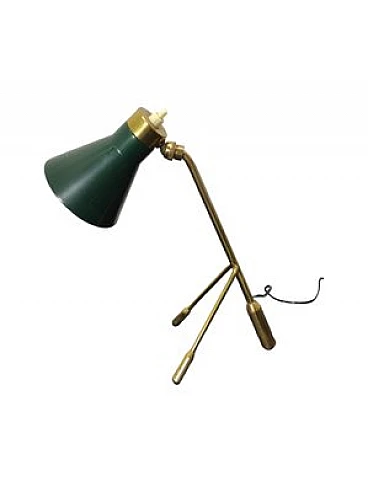 Splendid table lamp with compact measures. It takes the name of "ochetta" precisely for the shape similar to the nice bird. Piece attributed to the designer/manufacturer shown in the title. It does not have a trademark or proof of authenticity, but is documented in the history of design. Excellent conditions, it has light signs of use and time. The replacement of the electrical part, albeit working, is recommended. The materials used for the production of this article are brass (support structure) and metal (lampshade). Dimensions: 26 x 11.5 x 22 cm (h x l x p).