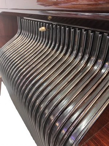 Elegant sideboard and/or mobile bar attributed to Osvaldo Borsani, 1950s. Its structure is characterized by a single -shaped design given by the surprising curved front profile of the central reversal door, very refined and finished with details of vertical grooves in ebanized wood. The interior of this compartment, as well as the drawers, are finished in shiny lacquered yellow maple. This mobile bar is ready for use, its vintage conditions are to be considered very good as shown by images, with slight signs of usury consistent with age and delicate use. Size: 179 x 146 x 50 cm (width x height x depth).