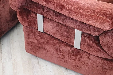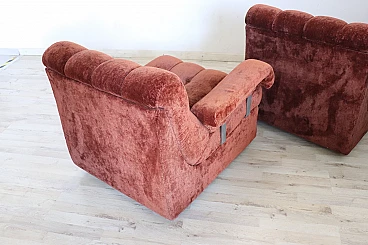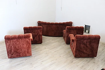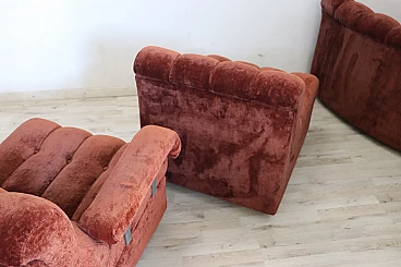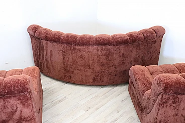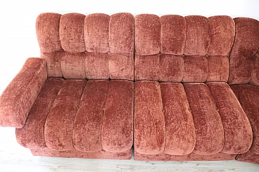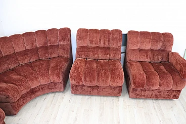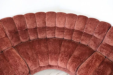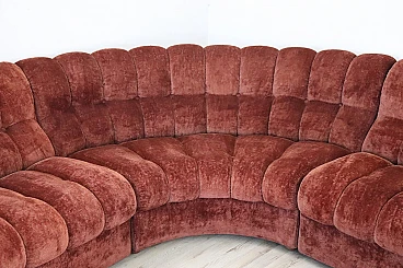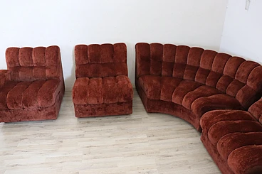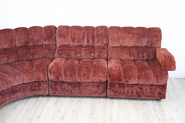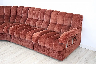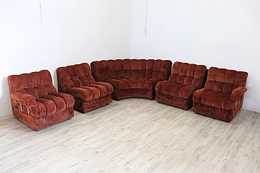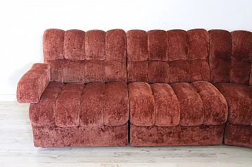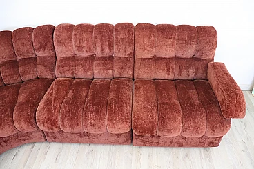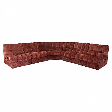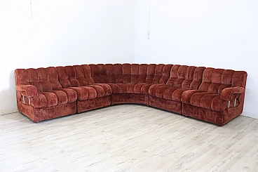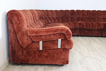 Rare corner modular sofa from the 1970s made of velvet of a distinctive brown color tending toward copper. It consists of five modules, including one round corner module. Each module has a distinctive petal shape. It features a comfortable seat. Its large size is perfect for large rooms. Each side from the corner measures 280 cm but you can compose the modules differently. Write to us for any additional information. No stains or damaged parts, excellent condition of padding as well. We advise you to take a good look at all the attached photos in detail. Offered at an excellent negotiable price, please send us your purchase proposals which we will gladly consider. Seat height: 43 cm. Professional packaging - insured shipping with couriers - delivery by appointment - street level only, no porterage to floors.