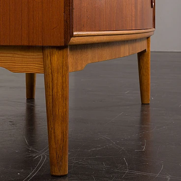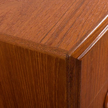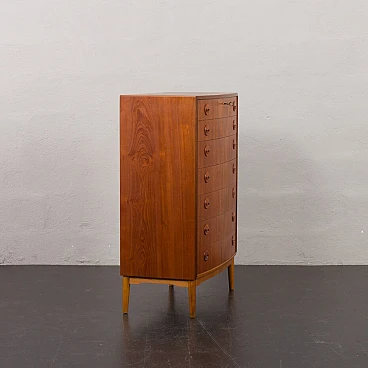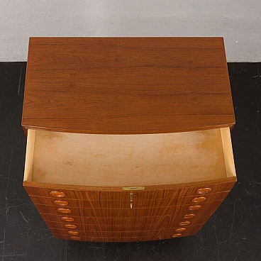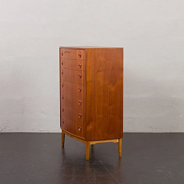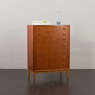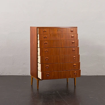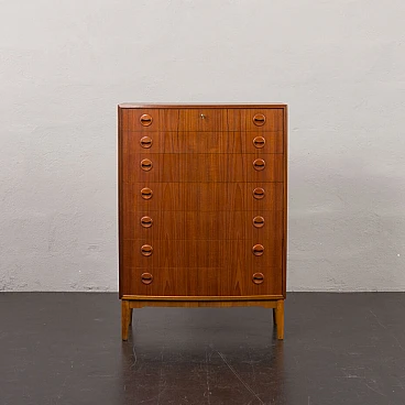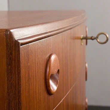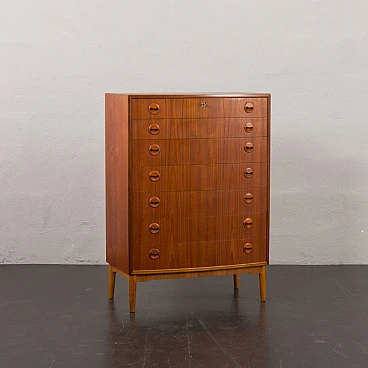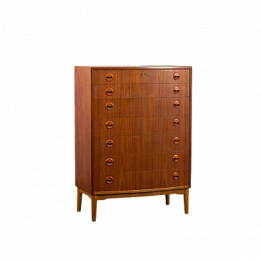 An elegant and functional chest of drawers by Kai Kristiansen made in Denmark in the 1960s. This is a rare seven-drawer model, also known as a semainier, popular in 18th-century France (the name comes from the French word for week, semaine), which was intended to separate the copious personal linen of the time in supplies from Monday to Sunday. The dresser has a nicely curved front with round solid teak handles, a teak base and features a beautiful and perfectly matching teak veneer. The top drawer closes with the preserved original key. The chest of drawers has been checked by our team. All drawers are clean and function smoothly. We have cleaned the wood meticulously and the surface has been refreshed with several coats of Danish oil. Excellent vintage condition with slight traces of use. We have two such drawers that can be purchased as a set.