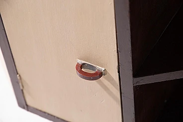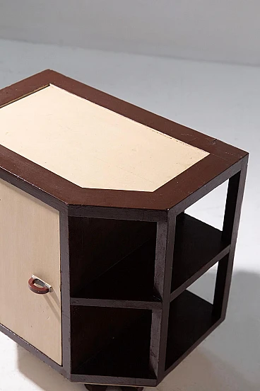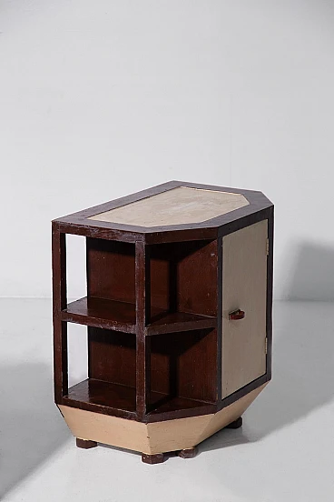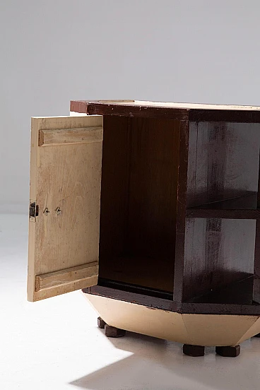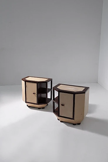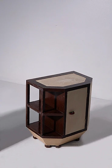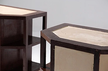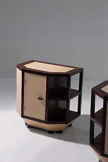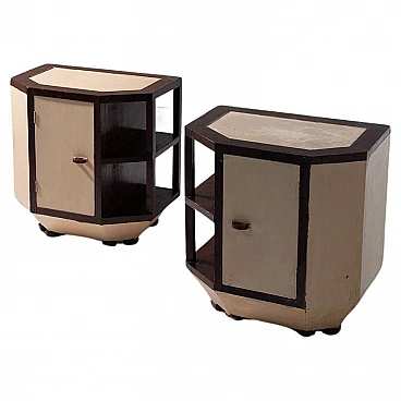 Explore a stunning pair of nightstands from the Italian Futurist period of the 1920s-30s, crafted with artistic style and practical ingenuity. These tables highlight the bold and experimental design characteristic of the era, made evident by their dynamic geometric shapes and the surprising two-tone color combination. Beyond their visual appeal, the tables feature practical shelves that offer ample storage space, combining functionality and avant-garde aesthetics. In their original condition, they possess a natural patina and carry signs of wear, which enhance the authenticity and historical charm, making them not only functional furniture but eye-catching pieces of art history.