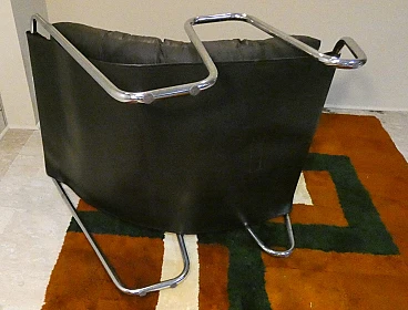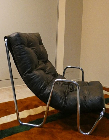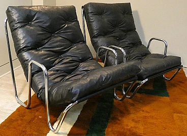 Pair of Californian style armchairs in black leather on chromed steel base. Removable and transportable. They are armchairs made of tubular chromed steel, removable in four parts, easy to transport and place. The tubular can be mounted on two different positions, thus varying the inclination of the seat, to switch from an armchair to a chaise longue. The leather hull is removable and foldable, as well as the leather cushions. The dismantled and folded armchair can be transported with a box of small dimensions. Jacques Charpentier (in the style of) for Roche Bobois Jacques Charpentier was a French industrial designer born in 1933 and died in 2018. He studied at the École des arts appliqués in Paris.