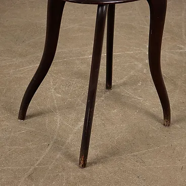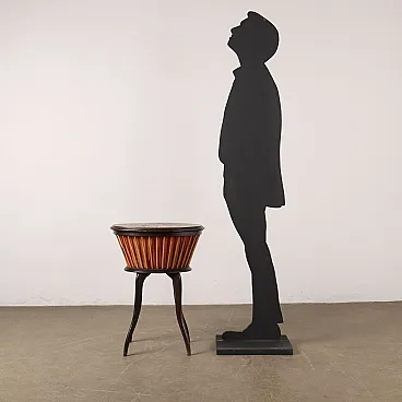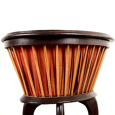 Art Deco work table in ebonised wood, Italy 1930s. Openable top veneered with walnut-root veneer, concealing fabric storage compartment inserted within a "cage" of maple-turned laths. Wavy legs.