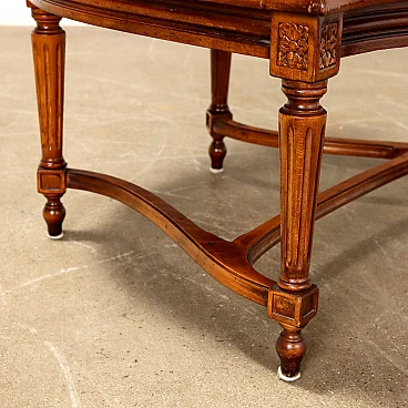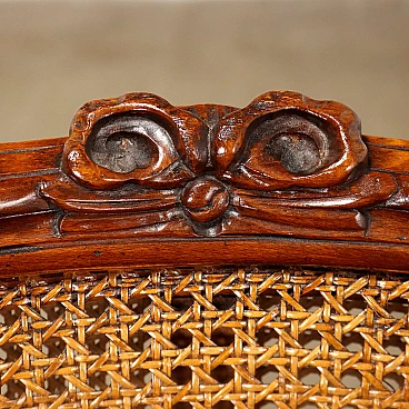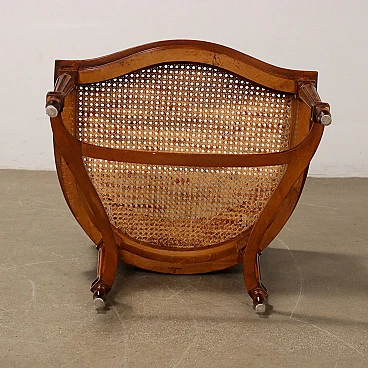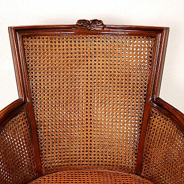 Neoclassical style armchair in beech, 20th century Italy. Carved love knot placed on the top of the backrest. Back, sides and seat with double caning; fluted truncated cone legs, the two front ones with carved rosettes, connected by wavy crosspieces and ending with pear-shaped feet. Seat equipped with removable cushion.