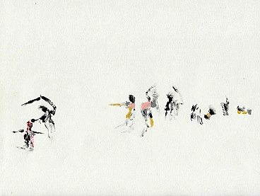 Blossom Light from Blood is an original painting realized by Iranian Painter and Poet Parimah Avani in 2022. China ink and acrylic on ivory-colored paper. Hand-signed and dated. Excellent conditions. Presented in a Personal exhibition of "le Poesie Di Lutto e Di Lotta " (The Poems of Struggle and Mourning) curated by Leda Bartolucci in Turin, Italy, Bagni Pubblici, 2022. The artwork is poetically created through expressionistic brush strokes, the well-applied dry and watery strokes from the series “The Poems of Struggle and Mourning " in poetic style representing revolutionary figures in a minimalistic manner. The various layer is made perfectly by the expression of brushes, which makes this series unique: is deeply behind the dynamic emotion of each figure and abstract form, four colors here have metaphorical features; pink as woman, yellow as hope, silvery as resistance, and red as blood. The panoramic lines inspired by Persian calligraphy created motifs and repetition harmoniously in a neat composition, each reminding mysterious words. The style of Persian calligraphy and her knowledge of poetry let her create a visual poem in an expressionistic style, which is congruent with the title and her experience, the use of space and maintaining an empty background and foreground intentionally have been made to emphasize the solitude and loneliness of figures and at the same time connect to oriental calligraphy in which empty space has the same value as the filled one, succeed to create pure incarnation. Her artworks artwork has evident characteristics, firstly strongly inspired by Tachisme's “Abstraction lyrique" and artworks of Henri Michaux, and Hans Hurting secondly oriental Persian calligraphy of poems style is evident in her artworks, finally dynamic sensation of revolutionary art, the slogan of street wall transformed into contemporary language and its features intuitively are subtly inserted. Parimah Avani (Born1988) is an Iranian Poet and visual artist, since 2009 has lived and studied in Italy, after graduating from the Fine Art Academy of Rome in painting continued her research on “Aesthetic of Talisman and Magics Text and Craft” and took her Ph.D. title in the Sapienza University of Rome in 2020. From her have been published books and illustrations of books. The Last book of her “ The Magic Scroll of Antalus” published in 2020 in Iran has been among the finalists for the “Shamlu” literature and Poetry award in 2021. Her main camp study has been mythology, ritual, and magic, and her art is strongly connected to the transfer of local and traditional folk art and its symbols into the contemporary language in a poetic style. In these series evidently, Avani has chosen Persian calligraphy for this transformation.