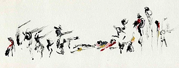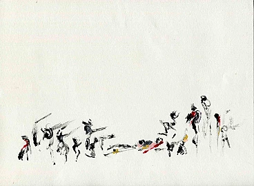 United with Victorious Rose is an original painting realized by Iranian Painter and Poet Parimah Avani in 2022. China ink and acrylic on ivory-colored paper. Hand-signed and dated. Excellent conditions. Presented in a Personal exhibition of "le Poesie Di Lutto e Di Lotta " (The Poems of Struggle and Mourning) curated by Leda Bartolucci in Turin, Italy, Bagni Pubblici, 2022. The artwork is poetically created through expressionistic brush strokes, the well-applied dry and watery strokes from the series “The Poems of Struggle and Mourning " in poetic style representing revolutionary figures in a minimalistic manner. The various layer is made perfectly by the expression of brushes, which makes this series unique: is deeply behind the dynamic emotion of each figure and abstract form, four colors here have metaphorical features; pink as woman, yellow as hope, silvery as resistance, and red as blood. The panoramic lines inspired by Persian calligraphy created motifs and repetition harmoniously in a neat composition, each reminding mysterious words. The style of Persian calligraphy and her knowledge of poetry let her create a visual poem in an expressionistic style, which is congruent with the title and her experience, the use of space and maintaining an empty background and foreground intentionally have been made to emphasize the solitude and loneliness of figures and at the same time connect to oriental calligraphy in which empty space has the same value as the filled one, succeed to create pure incarnation. Her artworks artwork has evident characteristics, firstly strongly inspired by Tachisme's “Abstraction lyrique" and artworks of Henri Michaux, and Hans Hurting secondly oriental Persian calligraphy of poems style is evident in her artworks, finally dynamic sensation of revolutionary art, the slogan of street wall transformed into contemporary language and its features intuitively are subtly inserted. Parimah Avani (Born1988) is an Iranian Poet and visual artist, since 2009 has lived and studied in Italy, after graduating from the Fine Art Academy of Rome in painting continued her research on “Aesthetic of Talisman and Magics Text and Craft” and took her Ph.D. title in the Sapienza University of Rome in 2020. From her have been published books and illustrations of books. The Last book of her “ The Magic Scroll of Antalus” published in 2020 in Iran has been among the finalists for the “Shamlu” literature and Poetry award in 2021. Her main camp study has been mythology, ritual, and magic, and her art is strongly connected to the transfer of local and traditional folk art and its symbols into the contemporary language in a poetic style. In these series evidently, Avani has chosen Persian calligraphy for this transformation.