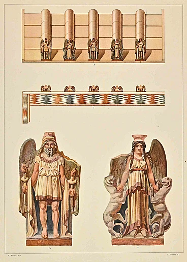 Decorative Motifs - Etruscan Styles is a print on ivory-colored paper realized by Andrea Alessio in the early 20th Century. Signed on the plate on the lower.Vintage Chromolithograph.Very good conditions.The artwork represents Decorative motifs through well-defined details with vivid and harmonious colors beautifully.