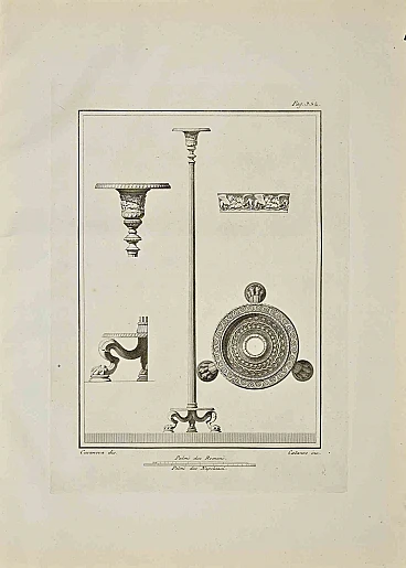 Ancient Roman Artifacts is an original etching on paper realized by Carlo Cataneo in the 18th Century. Signed on the plate. Good conditions with some foxing and folding and a small cut along the right margin. The etching belongs to the print suite “Antiquities of Herculaneum Exposed” (original title: “Le Antichità di Ercolano Esposte”), an eight-volume volume of engravings of the finds from the excavation of the ruins of Herculaneum in the Kingdom of Naples (now Campania, Italy). It was published between 1757 and 1792 by the Regia Stamperia, and copies were delivered to selected recipients across Europe. Despite the title, the Antiquity of Herculaneum shows objects from all the excavations undertaken by the Bourbons in the Gulf of Naples. These include Pompeii, Stabia and two sites of Herculaneum: Resina and Portici. The Bourbon King Carlo appointed fifteen scholars creating a new “Herculaneum Academy” to study the artifacts and publish the results of the archaeological excavations of the sites.The engravings are of high quality and the accompanying text shows a large scholarship. They were realized by 25 prominent artists involved by the King to prepare drawings and engravings on the finds, among which we can find Giovanni Elia Morghen, Carlo Nolli, Luigi Vanvitelli and Giovanni Battista Casanova.The “Antiquities” was designed more to amaze readers with the quality of the objects in the collection of the King of Naples than to be used in research., following and increasing the interest of 18th century society for the classical culture and Art in particular.Through the exaltation of the classical concept of proportions and harmony, the book was of inspiration to the neoclassical movement in Europe, giving artists and decorators access to a huge shop of Hellenistic motifs. Ref.: National Gallery (Washington), Mark J. Millard Architectural, IV (2000), no. 1; L. Garcia y Garcia, Nova bibliotheca pompeiana (2 v., 1998); Royal Institute of British Architects, British Architectural Library ... Early printed books, 1 (1994), no. 112. U. Pannuti, 'Incisori e disegnatori della Stamperia Reale di Napoli nel secolo XVIII: la pubblicazione delle Antichità di Ercolano', in Xenia antiqua, 9 (2000), p. 151-178; V. Trombetta, 'L'edizione de Le Antichità di Ercolano esposte' in Rendiconti dell'Accademia di Archeologia, lettere e belle arti di Napoli , 59 (1984), p.151-172.