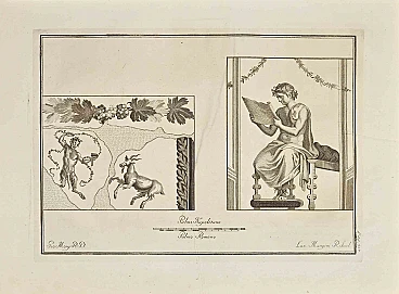 Ancient Roman Scene from the series "Antiquities of Herculaneum", is an original etching on paper realized by Giovanni Morghen in the 18th Century. Signed on the plate. Good conditions with some foxing and folding. The etching belongs to the print suite “Antiquities of Herculaneum Exposed” (original title: “Le Antichità di Ercolano Esposte”), an eight-volume volume of engravings of the finds from the excavation of the ruins of Herculaneum in the Kingdom of Naples (now Campania, Italy). It was published between 1757 and 1792 by the Regia Stamperia, and copies were delivered to selected recipients across Europe. Despite the title, the Antiquity of Herculaneum shows objects from all the excavations undertaken by the Bourbons in the Gulf of Naples. These include Pompeii, Stabia and two sites of Herculaneum: Resina and Portici. The Bourbon King Carlo appointed fifteen scholars creating a new “Herculaneum Academy” to study the artifacts and publish the results of the archaeological excavations of the sites.The engravings are of high quality and the accompanying text shows a large scholarship. They were realized by 25 prominent artists involved by the King to prepare drawings and engravings on the finds, among which we can find Giovanni Elia Morghen, Carlo Nolli, Luigi Vanvitelli and Giovanni Battista Casanova.The “Antiquities” was designed more to amaze readers with the quality of the objects in the collection of the King of Naples than to be used in research., following and increasing the interest of 18th century society for the classical culture and Art in particular.Through the exaltation of the classical concept of proportions and harmony, the book was of inspiration to the neoclassical movement in Europe, giving artists and decorators access to a huge shop of Hellenistic motifs. Ref.: National Gallery (Washington), Mark J. Millard Architectural, IV (2000), no. 1; L. Garcia y Garcia, Nova bibliotheca pompeiana (2 v., 1998); Royal Institute of British Architects, British Architectural Library ... Early printed books, 1 (1994), no. 112. U. Pannuti, 'Incisori e disegnatori della Stamperia Reale di Napoli nel secolo XVIII: la pubblicazione delle Antichità di Ercolano', in Xenia antiqua, 9 (2000), p. 151-178; V. Trombetta, 'L'edizione de Le Antichità di Ercolano esposte' in Rendiconti dell'Accademia di Archeologia, lettere e belle arti di Napoli , 59 (1984), p.151-172.