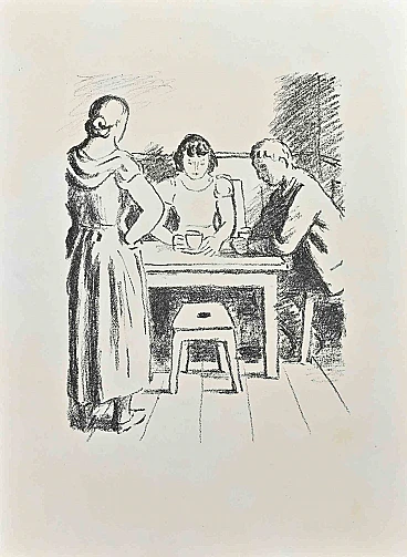 Breakfast is an original lithograph on ivory-colored paper realized by Wilhelm Gimmi in 1955 ca.Very Good Conditions. Not signed, as issued. The artwork is created in a realistic style through deft rapid strokes, conveying the scene's emotion in a delicate manner, chiaroscuro and hatching are perfectly applied. Wilhelm Gimmi (1886- 1965) was born in Zurich. In 1906 he graduated from the Scuola Normale di Küssnacht, then enrolled at the Kunstgewerbeschule di Zurich to teach design. He studied at the Académie Julian in Paris from 1908 to 1910, then joined Jean Arp, Walter Helbig and Oscar Lüthy in the Modern Bund movement, founded by Weggis in 1911. Residente in Paris from 1911 to 1940, he was a member of the Salon d "Autunno dal 1920.