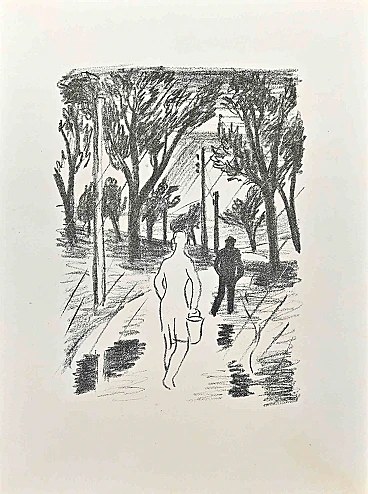 Walking Into The Forest is an original lithograph on ivory-colored paper realized by Wilhelm Gimmi in 1955 ca. Very Good Conditions. Not signed. as issued. The artwork is created in a realistic style through deft rapid strokes n a delicate manner, chiaroscuro and hatching are perfectly applied. Wilhelm Gimmi (1886- 1965) was born in Zurich. In 1906 he graduated from the Scuola Normale di Küssnacht, then enrolled at the Kunstgewerbeschule di Zurich to teach design. He studied at the Académie Julian in Paris from 1908 to 1910, then joined Jean Arp, Walter Helbig and Oscar Lüthy in the Modern Bund movement, founded by Weggis in 1911. Residente in Paris from 1911 to 1940, he was a member of the Salon d "Autunno dal 1920.