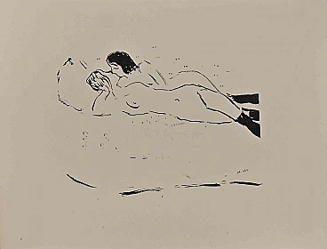 Erotic Scene is a beautiful lithograph on ivory-colored paper, realized in the 1920s by Albert Marquet (Bordeaux, 1875 - Paris,1947).Monogrammed on the plate on the lower margin. Stamped on the rear "Collection of Pecci-Blunt"From the Suite L'Académie des Dames, Open Edition in New York of "325".Good conditions with minor foxing.Albert Marquet (Bordeaux, 1875 - Paris,1947), French painter and close friend of Henri Matisse, Marquet is often associated with the Fauves ; nevertheless, some critics consider his art closer to that of Édouard Manet and the Impressionists . After 1909, he calmed the chromatic violence of his earliest works, and began using simplified forms and wide brushstrokes; he painted nudes, but most of all fluvial and marine landscapes. Marquet is considered a landscapist who painted scenes of Paris and of the lands he visited. The French painter often incorporated sea or rivers in his artworks, boasting his expert rendering of the silvery quality of light reflecting on water (like in Port de Marseille , 1924).