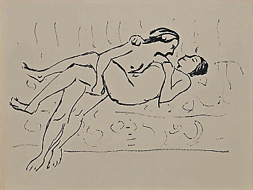 Erotic Scene is a beautiful lithograph on ivory-colored paper, realized in the 1920s by Albert Marquet (Bordeaux, 1875 - Paris,1947).Monogrammed on the plate on the lower margin. Staamped on the rear "Collection of Pecci-Blunt"From the Suite L'Académie des Dames, Open Edition in New York of "325".Good conditions with minor foxing.Albert Marquet (Bordeaux, 1875 - Paris,1947), French painter and close friend of Henri Matisse, Marquet is often associated with the Fauves ; nevertheless, some critics consider his art closer to that of Édouard Manet and the Impressionists . After 1909, he calmed the chromatic violence of his earliest works, and began using simplified forms and wide brushstrokes; he painted nudes, but most of all fluvial and marine landscapes. Marquet is considered a landscapist who painted scenes of Paris and of the lands he visited. The French painter often incorporated sea or rivers in his artworks, boasting his expert rendering of the silvery quality of light reflecting on water (like in Port de Marseille , 1924).