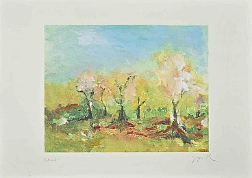 Landscape is a very colorful artwork realized by Martine Goyens in the late 20th Century.Digigraph print, retouched and colored by hand.Hand-signed.Good conditions.The artwork id created through harmonious colours by delicacy and created a poetic expression of nature.