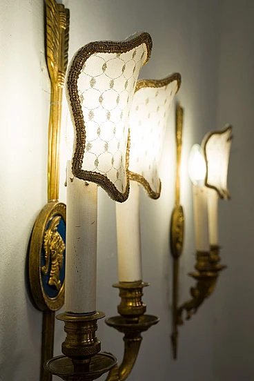 Pair of Neoclassical style bronze and fabric wall lights, 1940s
