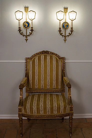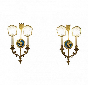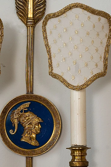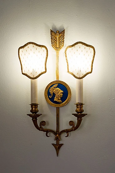 Pair of Neoclassical style two-light wall lamps in bronze and fabric, 1940s. They are adorned with finely detailed medallions depicting two mythological figures from Greco-Roman culture. One of the figures seems to recall Minerva, known as Athena in Greek mythology. The other could represent Mercury, known as Hermes to the Greeks. These details give the wall lights a unique historical and artistic charm. The arrow shape of the sconces is not only aesthetic but also symbolic, representing guidance, strength and speed. This shape ideally combines the distinctive characteristics of the two deities, creating a perfect combination of elegance and meaning. The tulle lampshades embroidered with gold thread add a touch of sophistication and luxury, perfectly complementing the lamps' vintage aesthetic. However, even without lampshades, the wall lights retain their extraordinary beauty, fully showing the attention to detail in their design. Restored, they have a new electrical system. They are illuminated by two lights with E14 bulbs, they are suitable for dimmable systems.