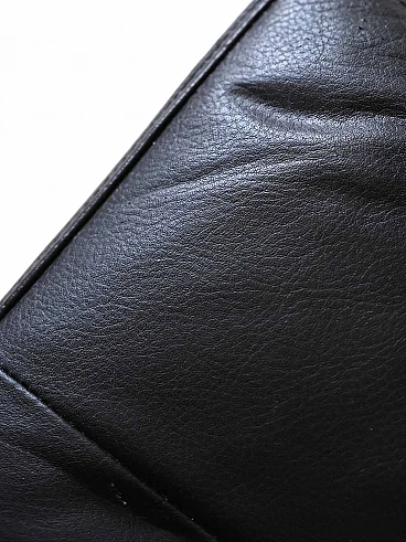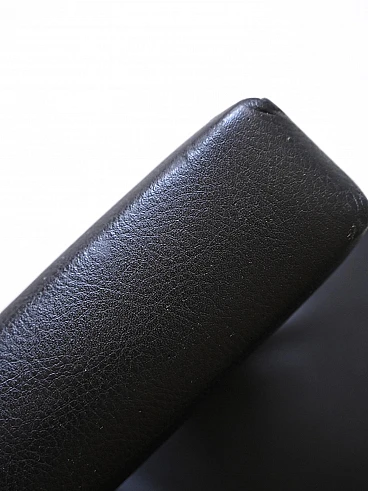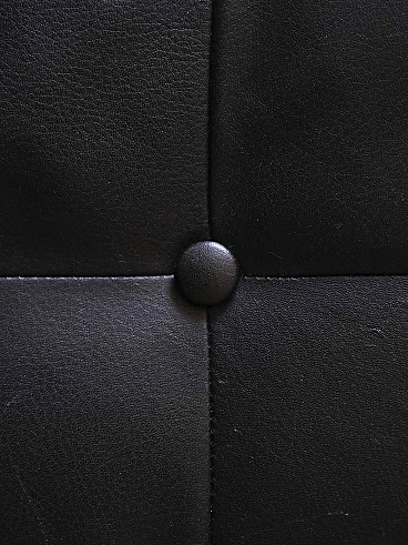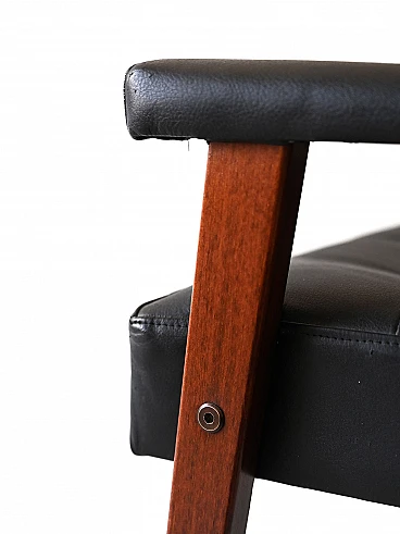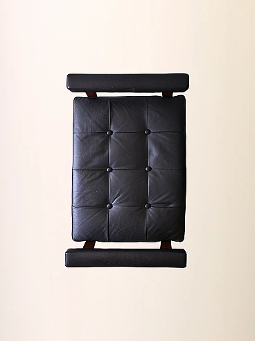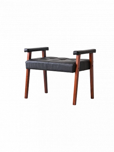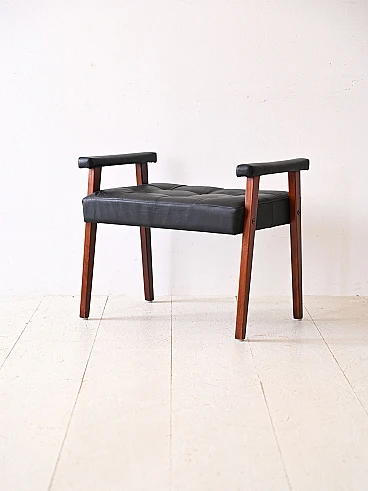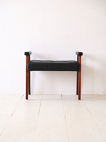 Scandinavian pouf/stool in wood and black imitation leather, 1960s-70s. This piece combines the charm of the past with modern functionality, perfect for adding personality to any environment. Its padded seat in black imitation leather gives it a timeless elegance, while the decorative buttons add a touch of refinement. The wooden supporting structure offers a solid and resistant base, ensuring durability over time. The distinctive feature of this stool are its overturned U-shaped legs, which emerge from the seat to form comfortable handles. This unique design not only adds style, but also allows you to move the furniture with ease, making it versatile and practical for any situation. Good condition, a conservative restoration was carried out with products of natural origin. It may show some signs of time. Pay attention to the photographs for more specific details.