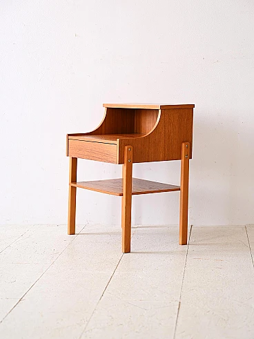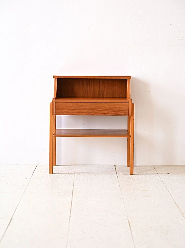 Teak bedside table by Carlström & Co Möbelfabrik, 1960s. Piece that embodies the elegance and functionality of Nordic design. Featuring a square shape and clean lines, it integrates seamlessly into a variety of modern environments. The bedside table features a double shelf, providing enough space to place lamps, books and other essentials near the bed. The built-in drawer adds further convenience. There is also a convenient magazine shelf. With its versatile design and timeless aesthetic, this bedside table can adapt to a variety of contexts, from the bedroom to the living room or study. Good condition, a conservative restoration was carried out with products of natural origin. It may show some signs of time. Pay attention to the photographs for more specific details.