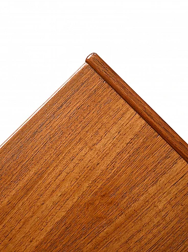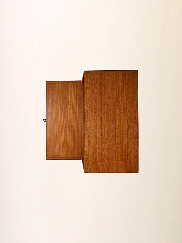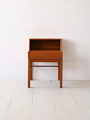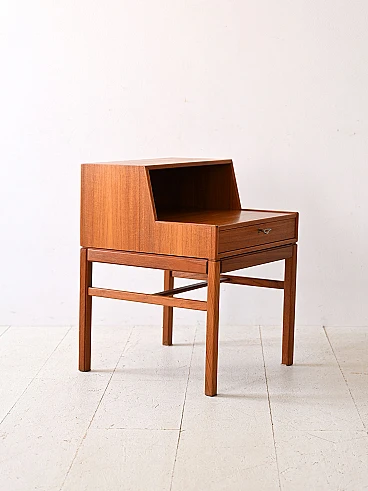 Scandinavian teak bedside table, 1960s. Featuring a square shape and clean lines, it integrates seamlessly into a variety of modern environments. It has a double shelf, providing enough space to place lamps, books and other essentials near the bed. The built-in drawer adds further convenience. With its versatile design and timeless aesthetic, this bedside table can adapt to a variety of contexts, from the bedroom to the living room or study. Good condition, a conservative restoration was carried out with products of natural origin. It may show some signs of time. Pay attention to the photographs for more specific details.