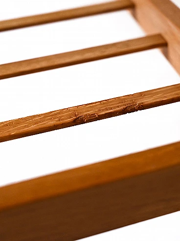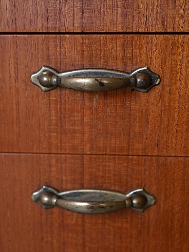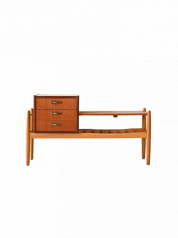 Scandinavian teak telephone bench, 1960s. Also known as a "gossip bench", it combines practicality and style, making it a distinctive addition to any entryway. The structure is divided into two sections: on one side, a support surface ideal for placing bags, keys or other daily objects, with a second shelf below made up of wooden slats, perfect for storing shoes or accessories. On the other side, three spacious drawers with gold metal handles offer additional storage space. The minimalist design and clean lines typical of Scandinavian design are combined with high-quality materials, making this bench not only functional but also extremely aesthetic. Perfect for the entrance, this bench can also be used in other parts of the house, such as the corridor or bedroom, offering a versatile and sophisticated piece of furniture. Good condition, a conservative restoration was carried out with products of natural origin. It may show some signs of time. Pay attention to the photographs for more specific details.