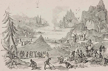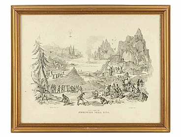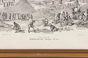 Permanence in the moon is a lithograph made by Gaetano Dura.Title on the lower center. Published by Lithography Fergola, Naples (printed on lower center). XX century. On lower right is printed: Museo Aeronautico Caproni Taliedo.Includes frame: 46.5 x 58 cmGood conditions, except for some foxings.This lithograph illustrates one of the six articles, titled " Great Moon Hoax ", published in The Sun , a newspaper of New York, in 1835, about the possible discovery of life and civilization on the Moon. The discoveries were falsely attributed to Sir John Herschel , one of the most well-known astronomers at the time.The intention of the article's anonymous author, who later revealed his identity (Richard Adams Locke), was likely satirical, even though it was taken for real news. All the articles were translated into various languages and published internationally. In 1836, an Italian translation of the French edition was published in Naples with the title " Delle scoperte fatte nella luna del dottor Giovanni Herschel ". Gaetano Dura is the author of all the lithographs inside the collection of articles.Gaetano Dura (Cassano Jonio/Cosenza, 1805 - Naples, 1878) was a very famous Italian lithographer, watercolor artist, and poet.Permanence in the moon, original title Permanenza nella Luna, is a fun lithograph that represents the arrival on the Moon of Pulcinella , the traditional Neapolitan mask created during the second half of the XVI century for the Commedia dell'Arte.
