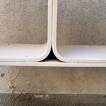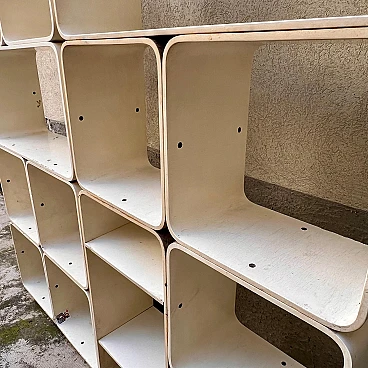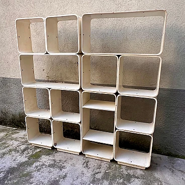 The bookcase in the photo, attributed to Carlo De Carli and produced by Fiarm in the 1970s, consists of two separate bodies but offers the possibility of combining them into a single element. It is made of rectangular and square modules in white lacquered wood with rounded corners, arranged in four vertical rows and four horizontal columns. The structure has several open compartments, some of which have internal shelves, offering a versatile configuration for arranging books and objects. The surfaces are smooth and even, with signs of use and light wear visible on some modules. In addition, you can simply disassemble all the modules to assemble it again, completely changing the configuration. The simple and functional design reflects De Carli's innovative style, with a focus on aesthetics and practicality. This particular model stands out for its innovative use of materials and modularity that allows it to adapt to different space and style requirements.