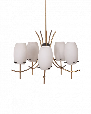 5-Light chandelier in gilded brass, metal and white glass, 1960s