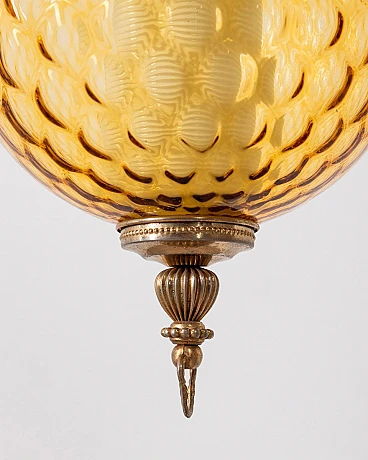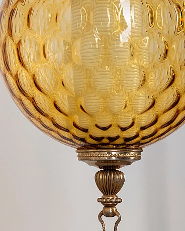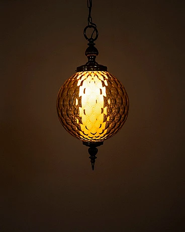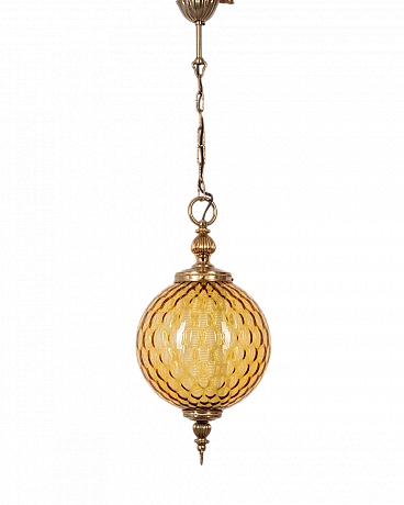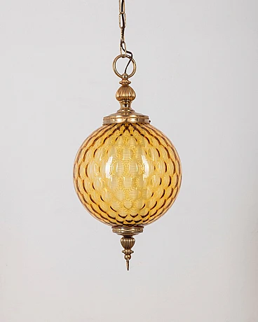 Ceiling lamp in golden brass with amber glass sphere, 1960s