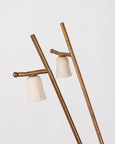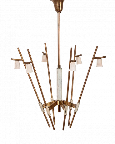 Chandelier with golden brass and white metal structure, with six lights, Italian design, 1950s.
