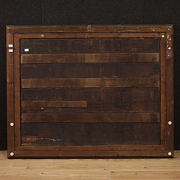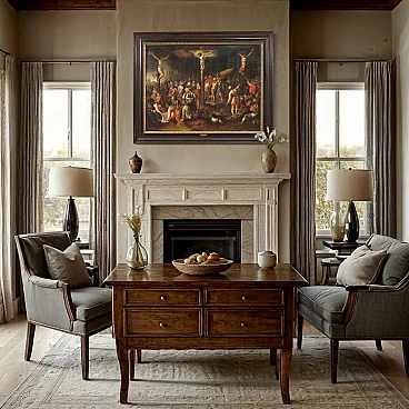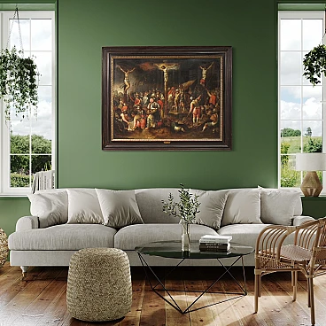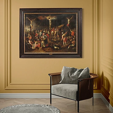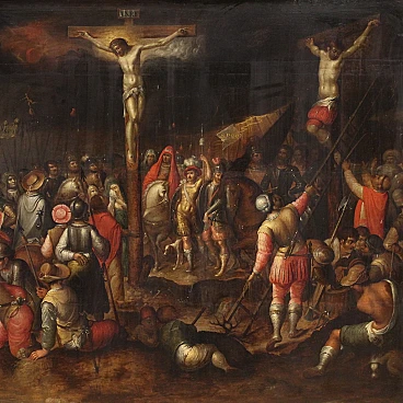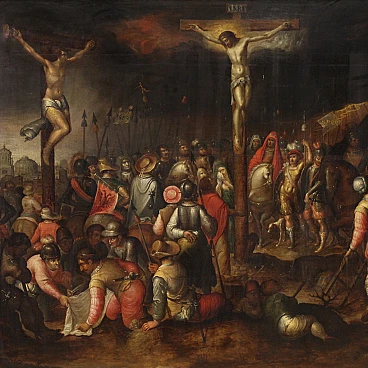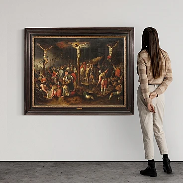 Ancient Flemish painting from the first half of the 17th century. Oil on panel work attributable to the workshop of the painter Ambrosius Francken II (1581-1632); lacking authenticity. A pupil of his father, he worked mainly in Antwerp and specialized in religious paintings. The painting in question depicts the Crucifixion on Mount Calvary (also called Golgotha). A painting of notable pictorial quality with over fifty characters masterfully painted down to the smallest detail and full of fascinating details such as the sweet dog at the bottom right. Instead, at the bottom left we find the soldiers intent on sharing Jesus' clothes. All around, knights in armour, religious people and peasants crowd the scene in a whirlwind that gives dynamism to the composition. At the foot of the cross we glimpse the Madonna in tears, Magdalene and Saint John the Evangelist who is in despair. At the top left, behind one of the thieves, we glimpse splendid buildings in Jerusalem. 20th century frame in carved and gilded wood, with some signs of time. Work that has undergone restoration with color recovery in some small points, overall in good state of conservation. Size without frame: 91 x 121.5 cm.