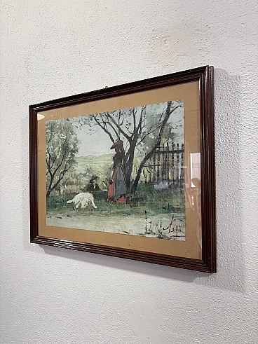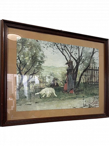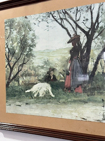 Print of woman walking with dog. Height 46 cm, width 60 cm. Print on paper. In good conservative condition, present signs of time due to use and age, see photos. If you require further detailed photos, please do not hesitate to contact us privately.