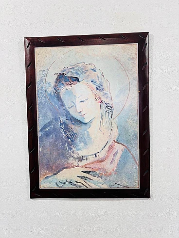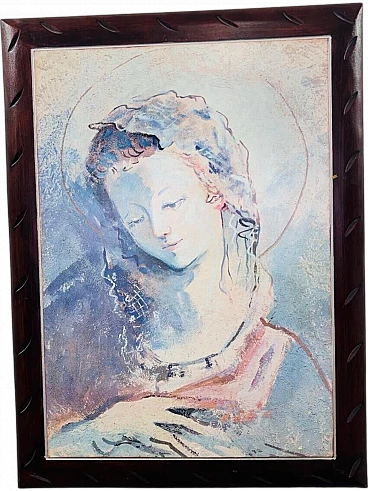 Mixed media painting on wood depicting a close-up of a woman. Good conservative condition, with signs of time due to use and age (see photos).