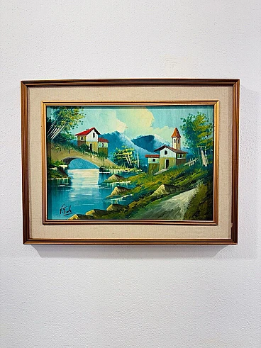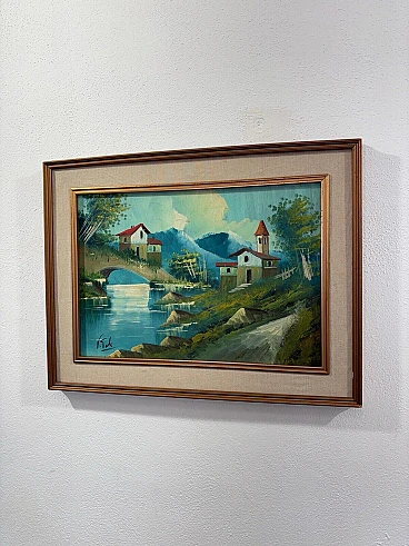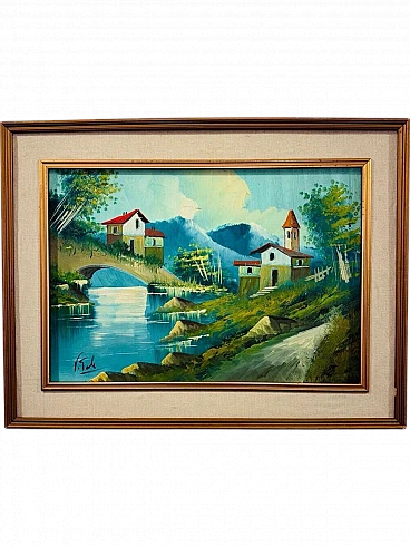 Oil painting on canvas depicting a landscape with a stream, signed Vitali. Good conservative condition, with signs of time due to use and age (see photos).
