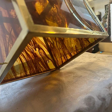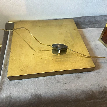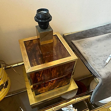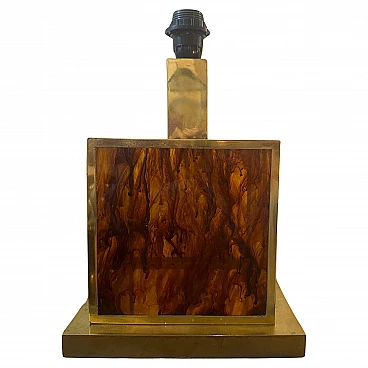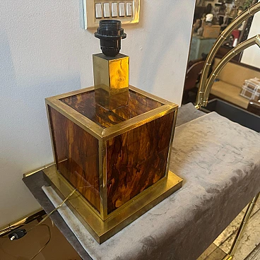 A mid-century modern square fake tortoise lucite and brass italian table lamp designed and manufactured in Italy in the style of Dior Home which used the fake tortoise lucite on many items of its collection. The lamps is in working order and in very good condition overall, due to bad condition of the original lampshade, it comes without it. As you can see on the photos the lamp is composed of two pieces, a brass base and a lucite and brass body. This Table Lamp is an elegant and distinctive piece that combines the luxurious feel of brass with the unique, textured look of fake tortoise Lucite. Its geometric shape, quality craftsmanship, and stylish materials make it a standout example of mid-century modern design with a 1970s twist. Italian craftsmanship is evident in the precise construction and the harmonious blending of materials. Attention to detail is seen in the seamless integration of brass and Lucite, ensuring a cohesive and elegant appearance.