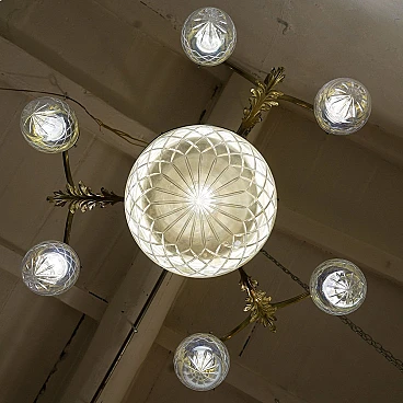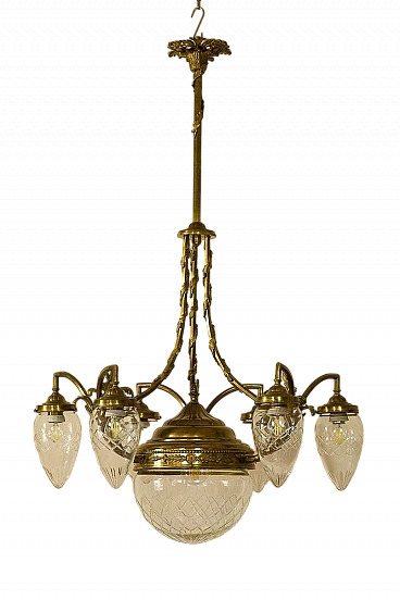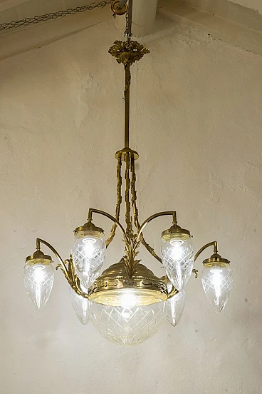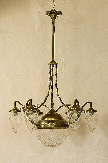 An antique Art Nouveau (Liberty) chandelier made in Italy in 1910-1920 during La Belle Époque. The chandelier is characterised by a sturdy brass structure, embellished with various festoons and floral decorations that give the imposing figure grace and elegance. The long central stem is traversed by an ivy-shaped frieze, supports 6 curved arms with pinecone-shaped crystal globes and a large central crystal globe, has a total of 7 lights (E27).