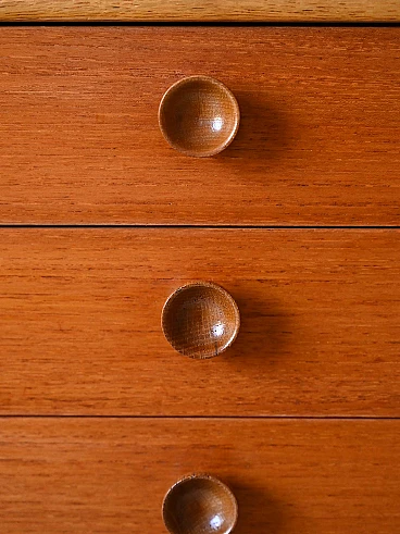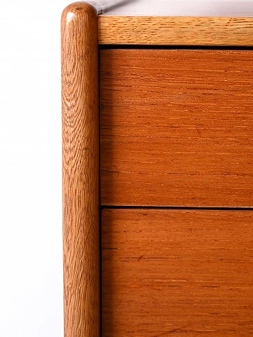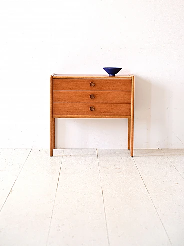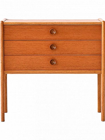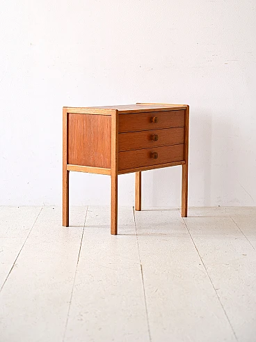 Scandinavian teak and oak bedside table with three drawers, 1960s. An authentic piece that embodies the design spirit of the era. Made of teak, it features a solid and durable frame embellished with oak edges that add a touch of elegance and contrast. With three spacious drawers, this cabinet offers ample storage space for neatly stowing personal items. Wooden knob handles lend a vintage feel and sense of authenticity to the piece, while slender, square legs lend lightness to the figure. Perfect as a nightstand to give a modern and original look to the room. Good condition, conservative restoration has been done with natural products. It may show some signs of time. Pay attention to photographs for more specific details.