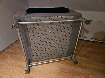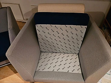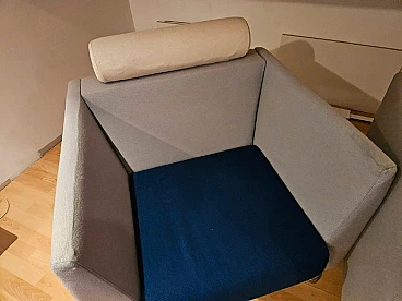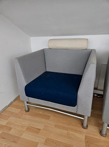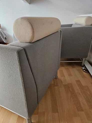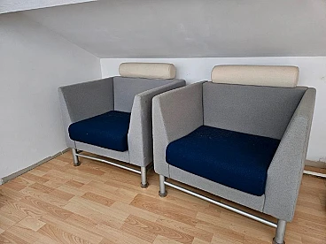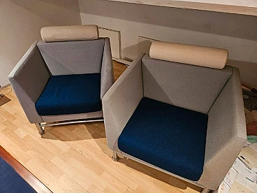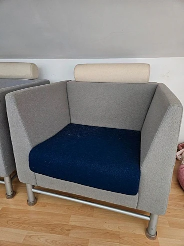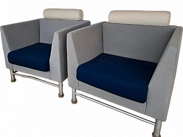 Pair of Eastside armchairs by Ettore Sottsass Jr. for Knoll, 1984. Model designed in 1983. These armchairs are from a 1984 production, they are 40 years old worn very well. Very good condition considering their age; they have minimal signs of use, a few light haloes, some wear spots on the fabric, minimal lint. Steel frame and cold-formed polyurethane foam, light gray upholstery fabric, blue cushion, beige-havana cylindrical headrest. Gray lacquered steel base with translucent plastic finials. The model is the work of famous designer-architect Ettore Sottsass Jr (1917-2007). The Centre Pompidou dedicated an exhibition to him in 2021; he is the embodiment of postmodernism, the founder of the influential and multifaceted Memphis group; the Eastside cubic armchair is a perfect example. Seat height: 41 cm.