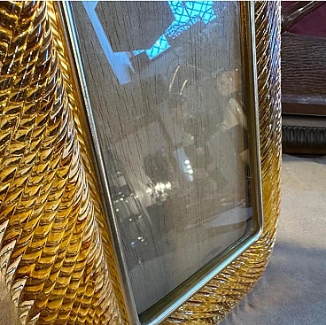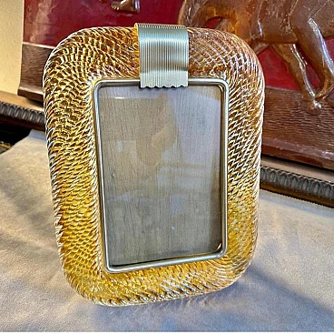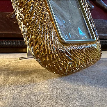 Amber Murano glass and brass photo frame, 1990s. Designed and produced in Venice in the style of Barovier. It is a beautiful and elegant piece of furniture, perfect for displaying your favorite memories in style. Barovier is a renowned Italian glass company that has been in business since 1295, and its products are highly prized by collectors and design enthusiasts. The photo frame has a rectangular shape with a clean inner frame made of solid brass. The outer part of the frame is made of amber Murano glass, carefully crafted by skilled artisans; each piece is unique due to the nature of the glassmaking process. This photo frame is a perfect example of the Art Deco style, popular in the early 20th century, characterized by bold geometric shapes, elegant lines, and a focus on luxury and craftsmanship.